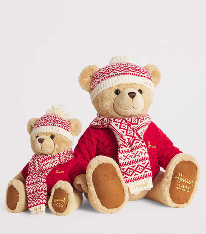 こちらは今年のクリスマスのテディベアです。ツリーを飾ったり、アドベントカレンダーでクリスマスまでの日数を数えたりするのと同じくらい、この季節の風物詩であるハロッズのクリスマスベア無しではこの季節は完結しません。 2025年版のアルフィーベアは暖かな赤いケーブル網のセーターを着て、お揃いのボンボン付き帽子とマフラーで防寒。